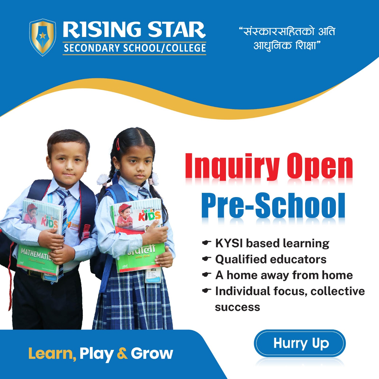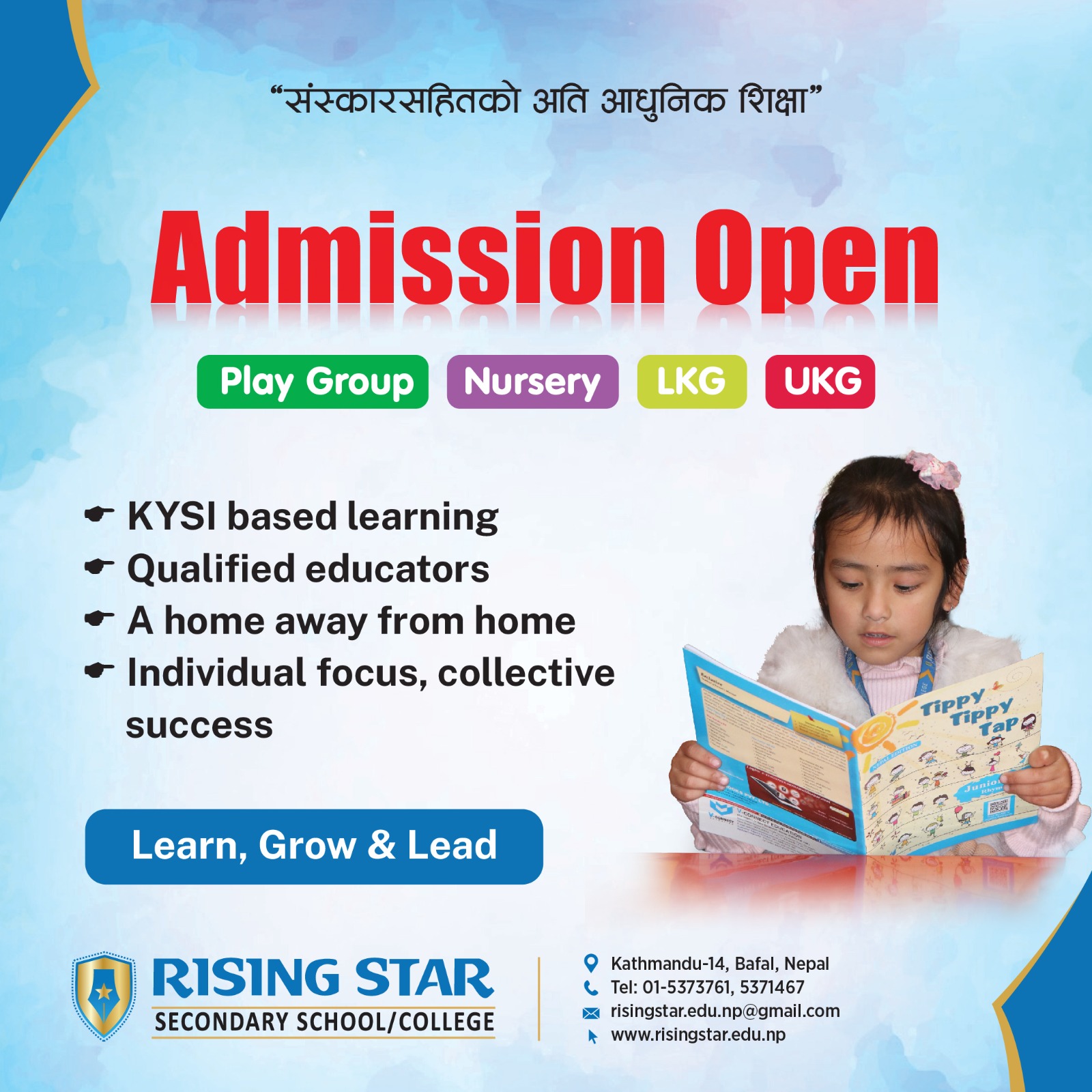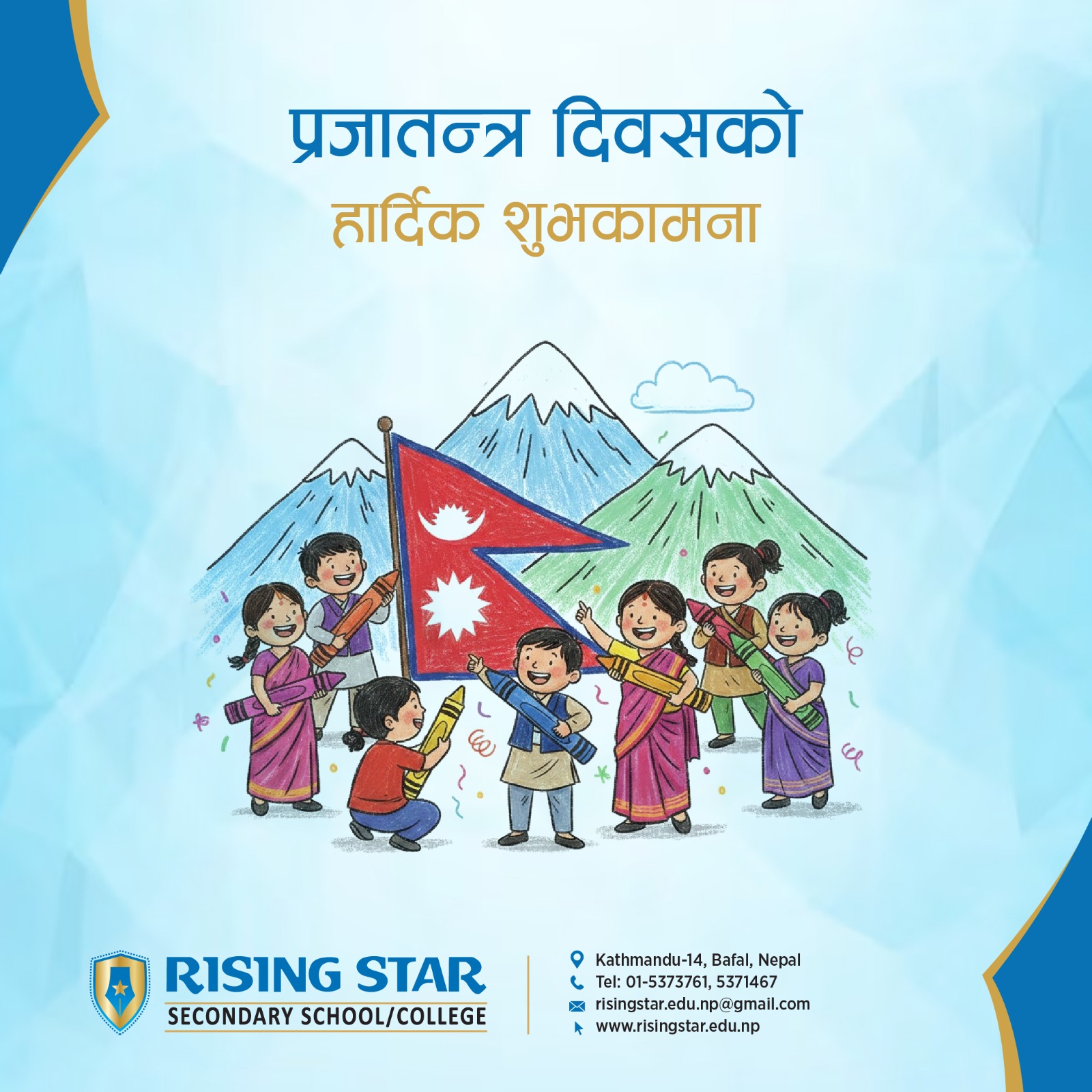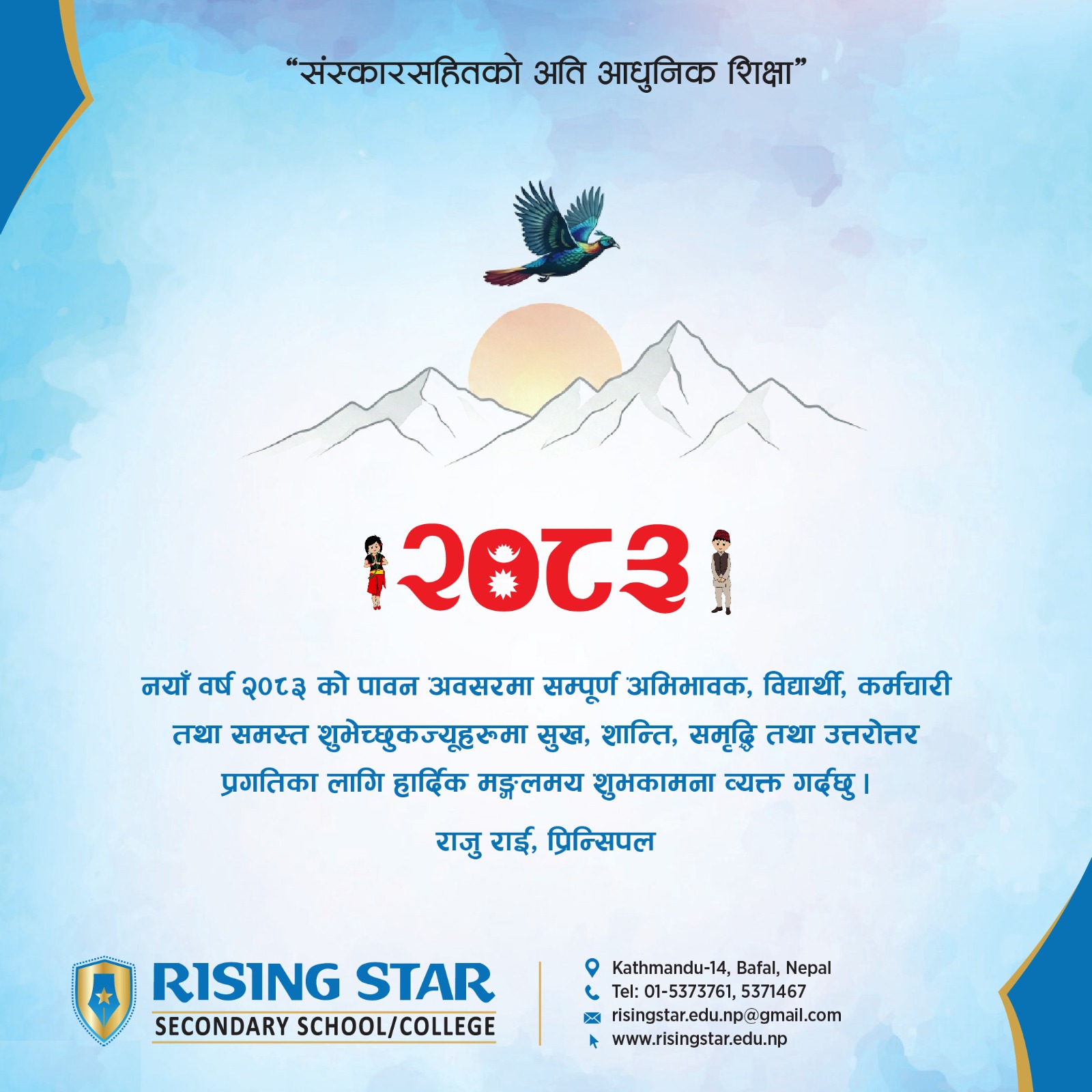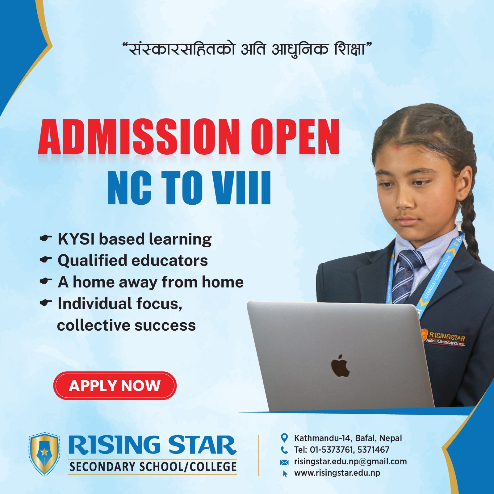 Rising Star School is a pioneer and leading co-educational wing of Rising & Company Kathmandu Private Limited (RCKPL), is established with a dynamic curriculum and a team of passionate educators to provide a competitive and quality education along with a moral and cultural values. Under the management of RKCPL, Rising Star School, Rising Star Kindergarten Pre-School and Nepal College of Management (BBS) is currently running.